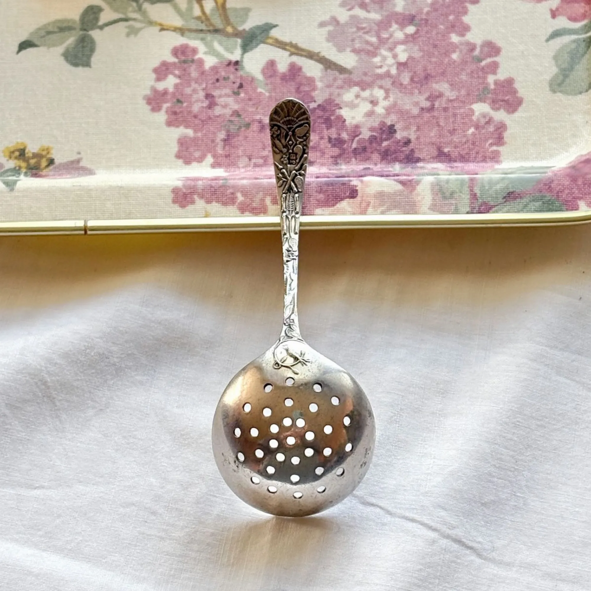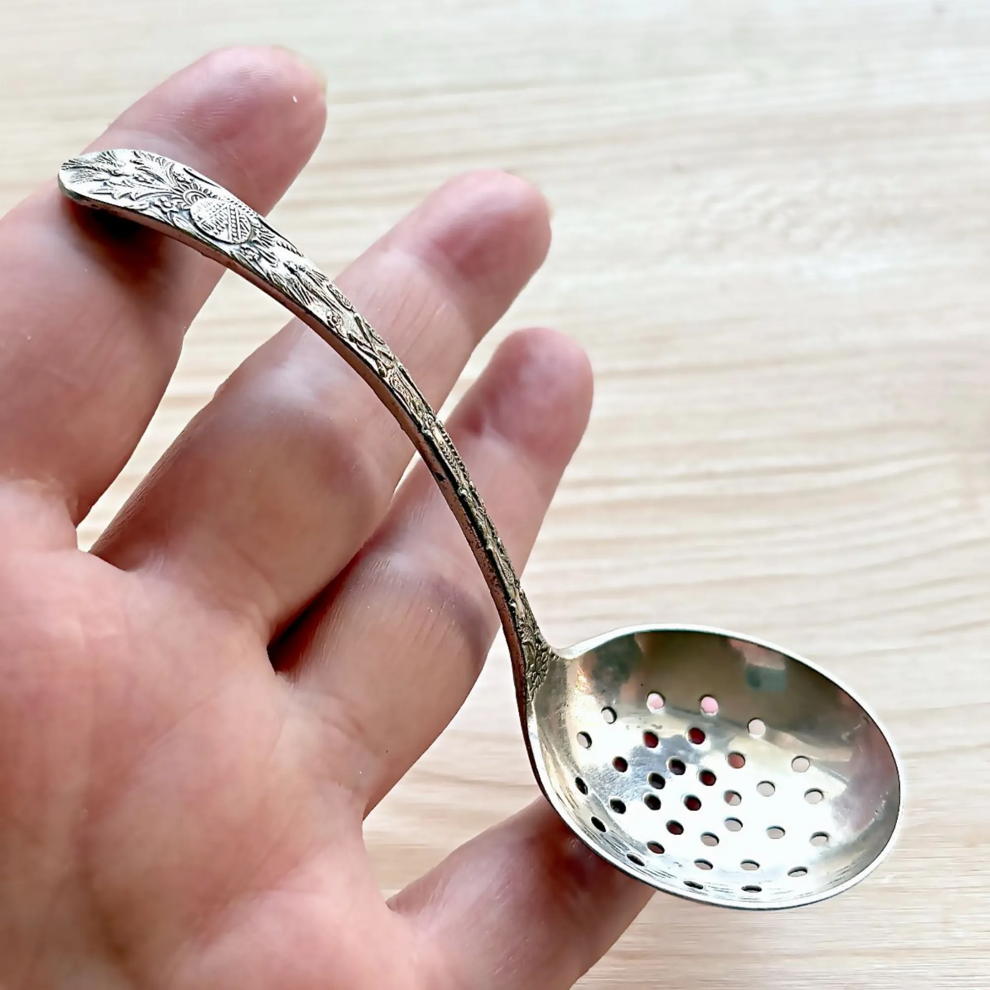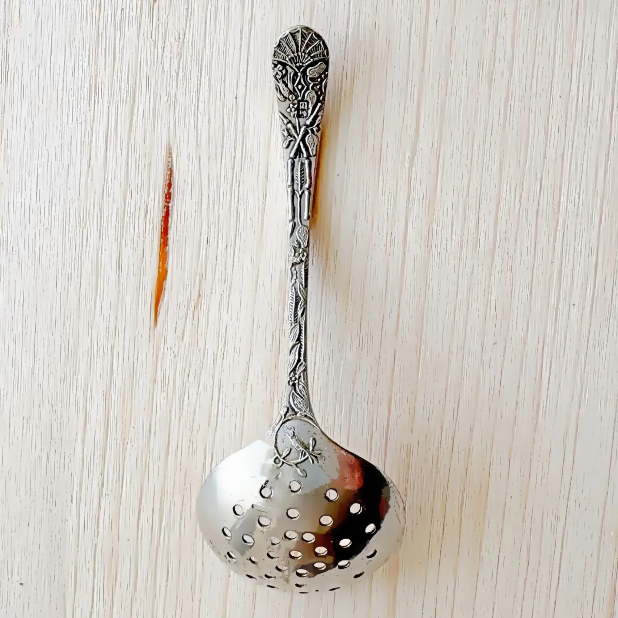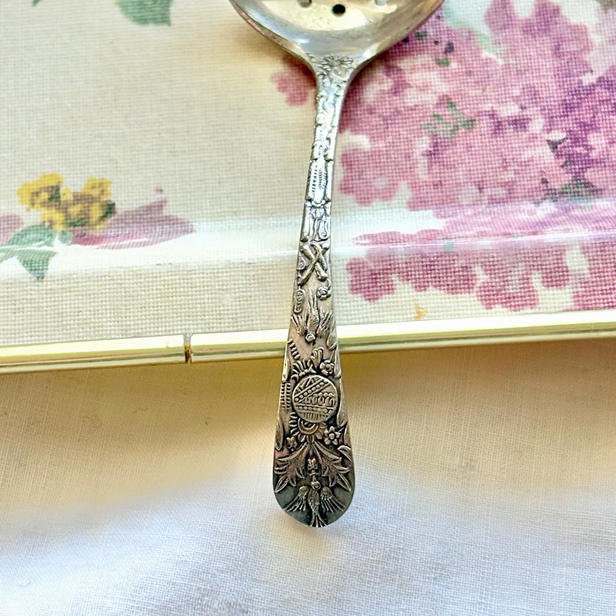- Le Verso (Le Secret) : C'est mon détail préféré ! Juste au-dessus du cuilleron percé, une minuscule ciselure révèle un héron (ou échassier) niché au cœur de la végétation aquatique. Un travail d'une finesse incroyable pour un objet de cette taille.