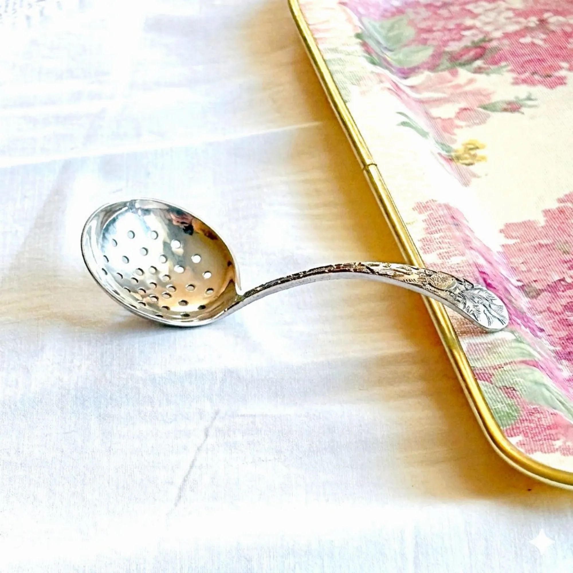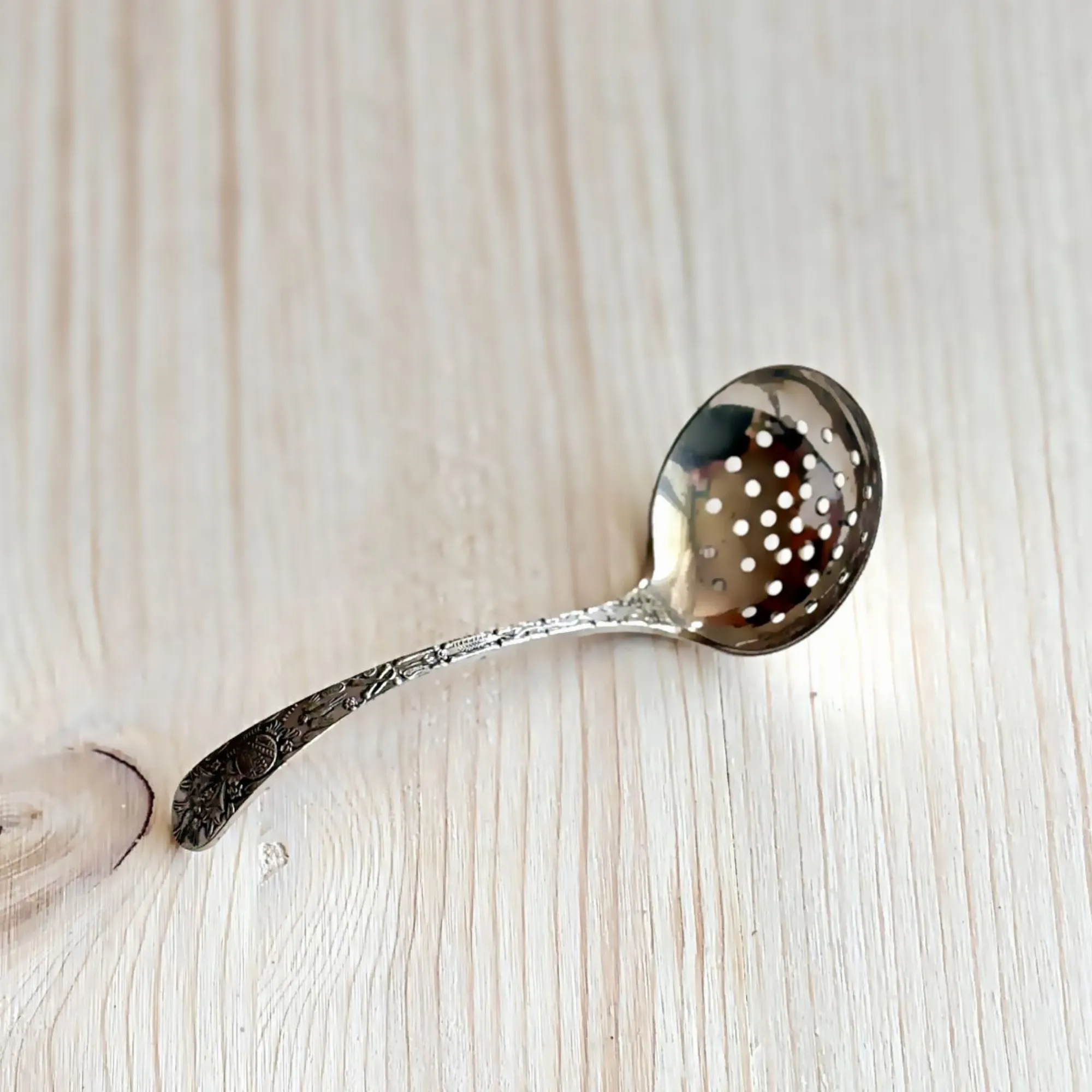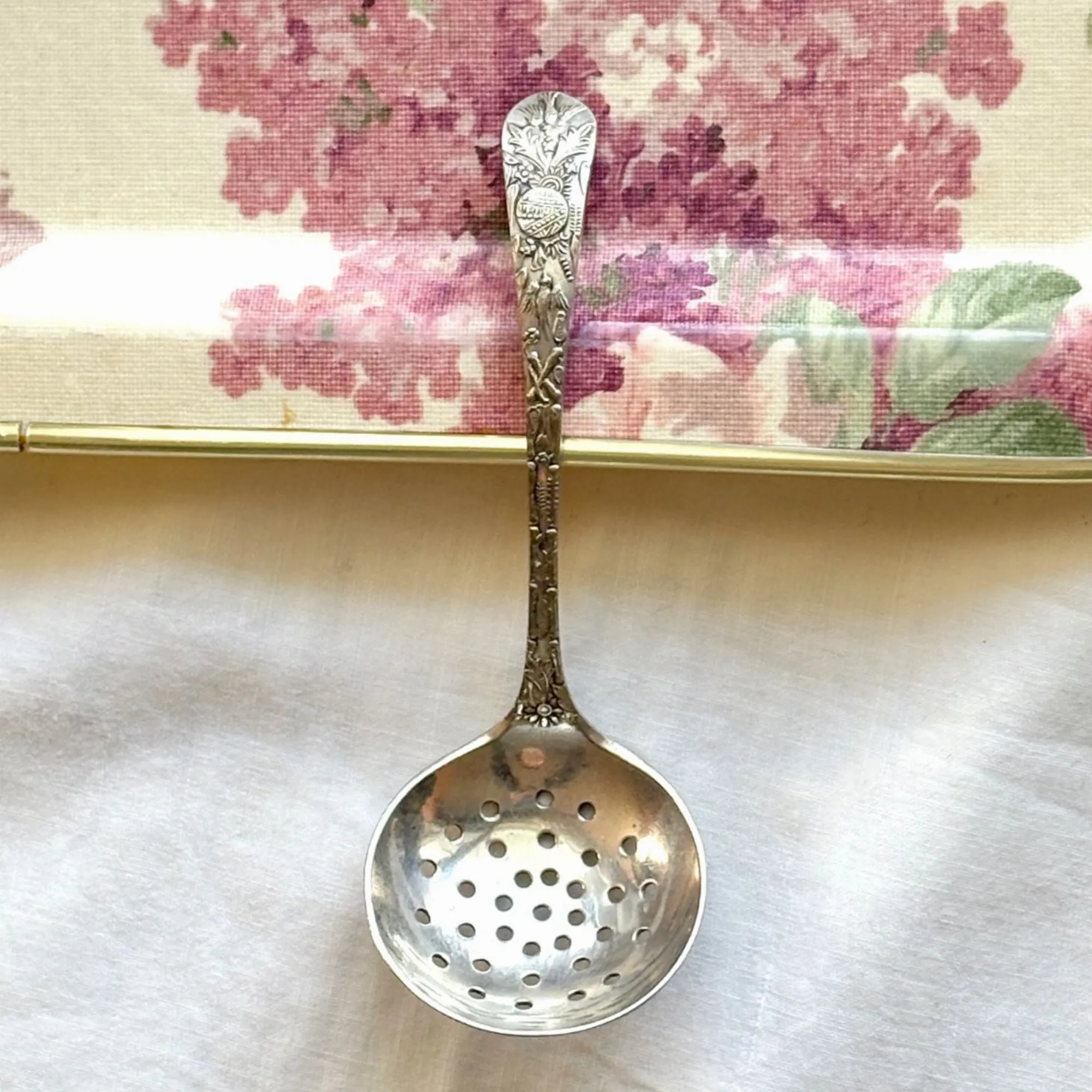 - Le Verso (Le Secret) : C'est mon détail préféré ! Juste au-dessus du cuilleron percé, une minuscule ciselure révèle un héron (ou échassier) niché au cœur de la végétation aquatique. Un travail d'une finesse incroyable pour un objet de cette taille.