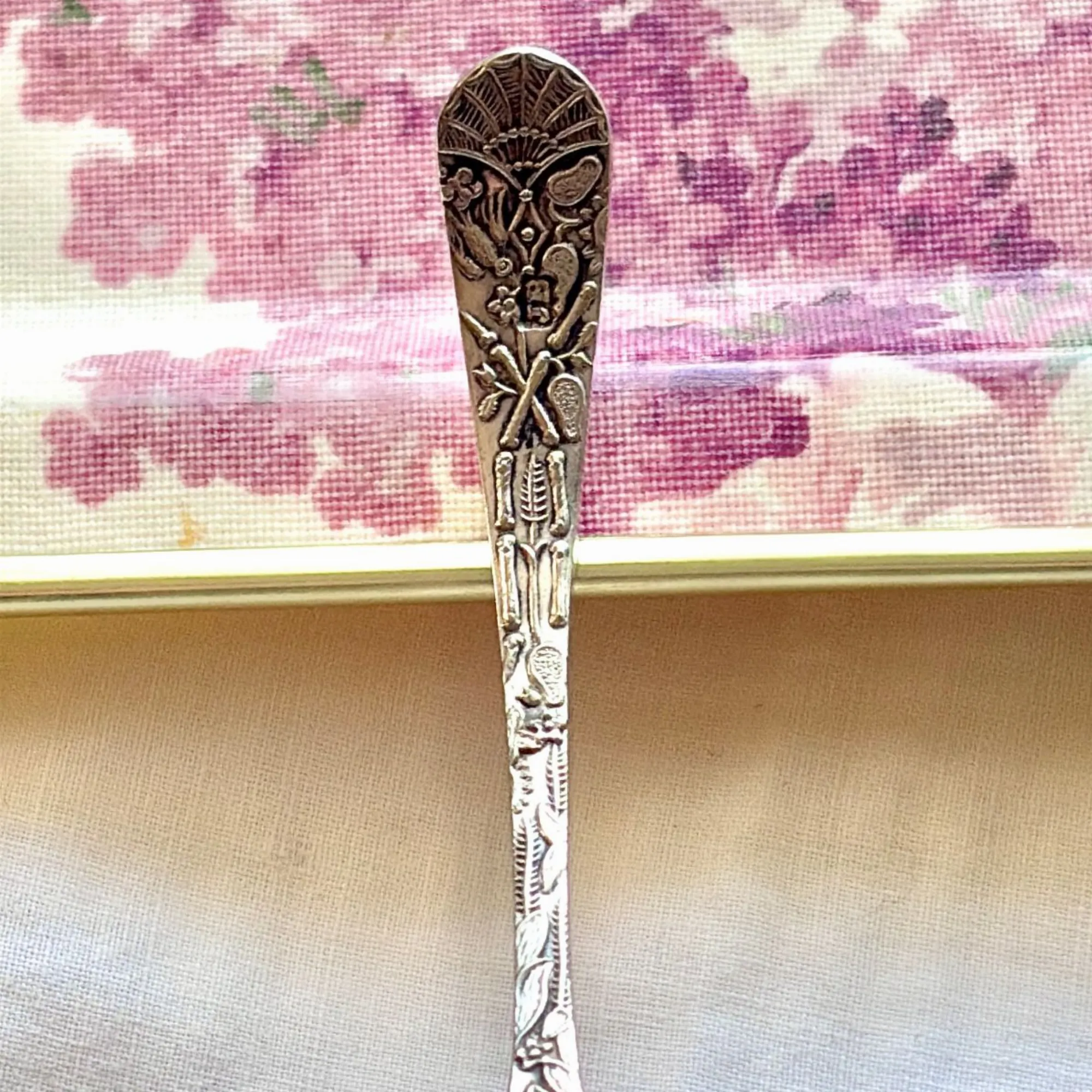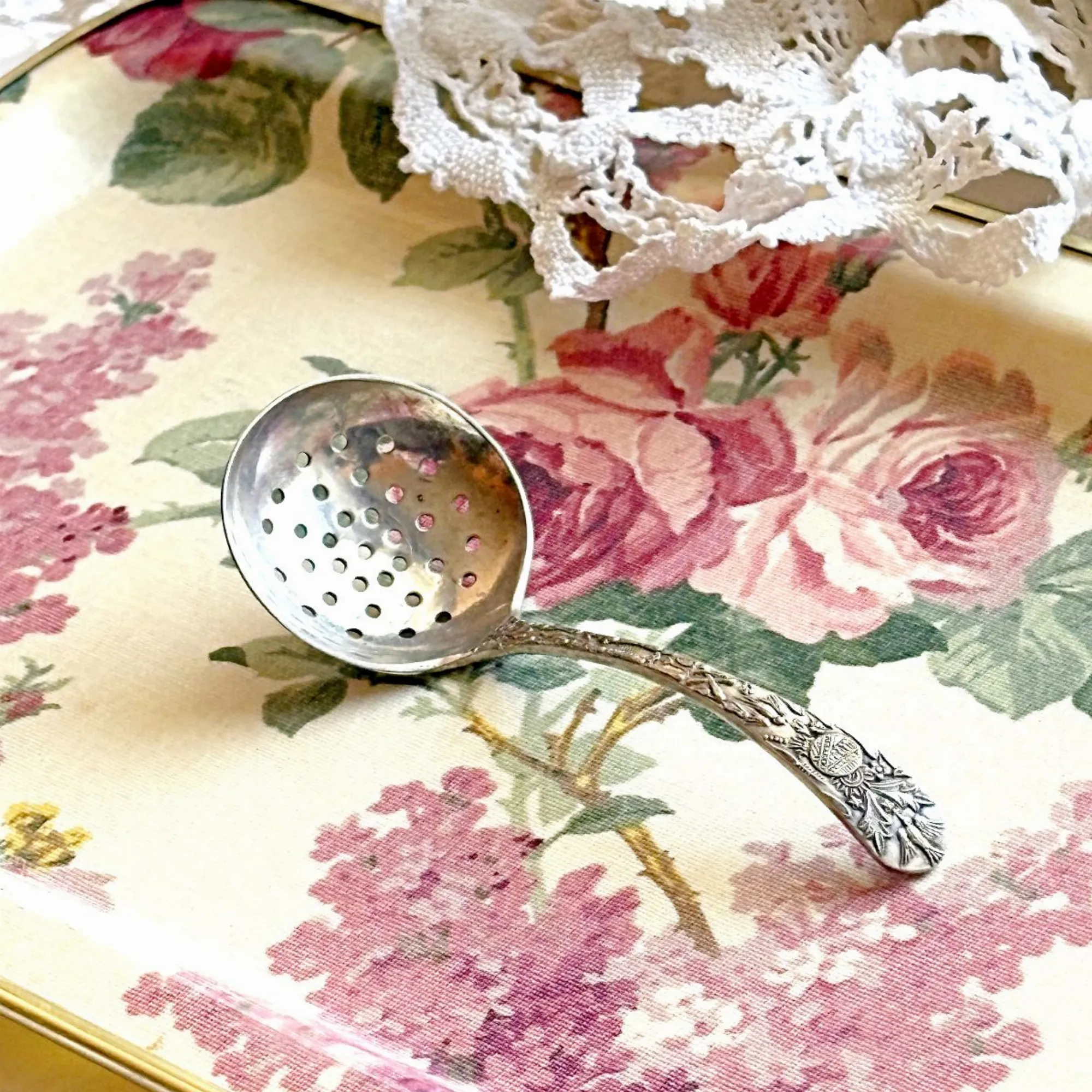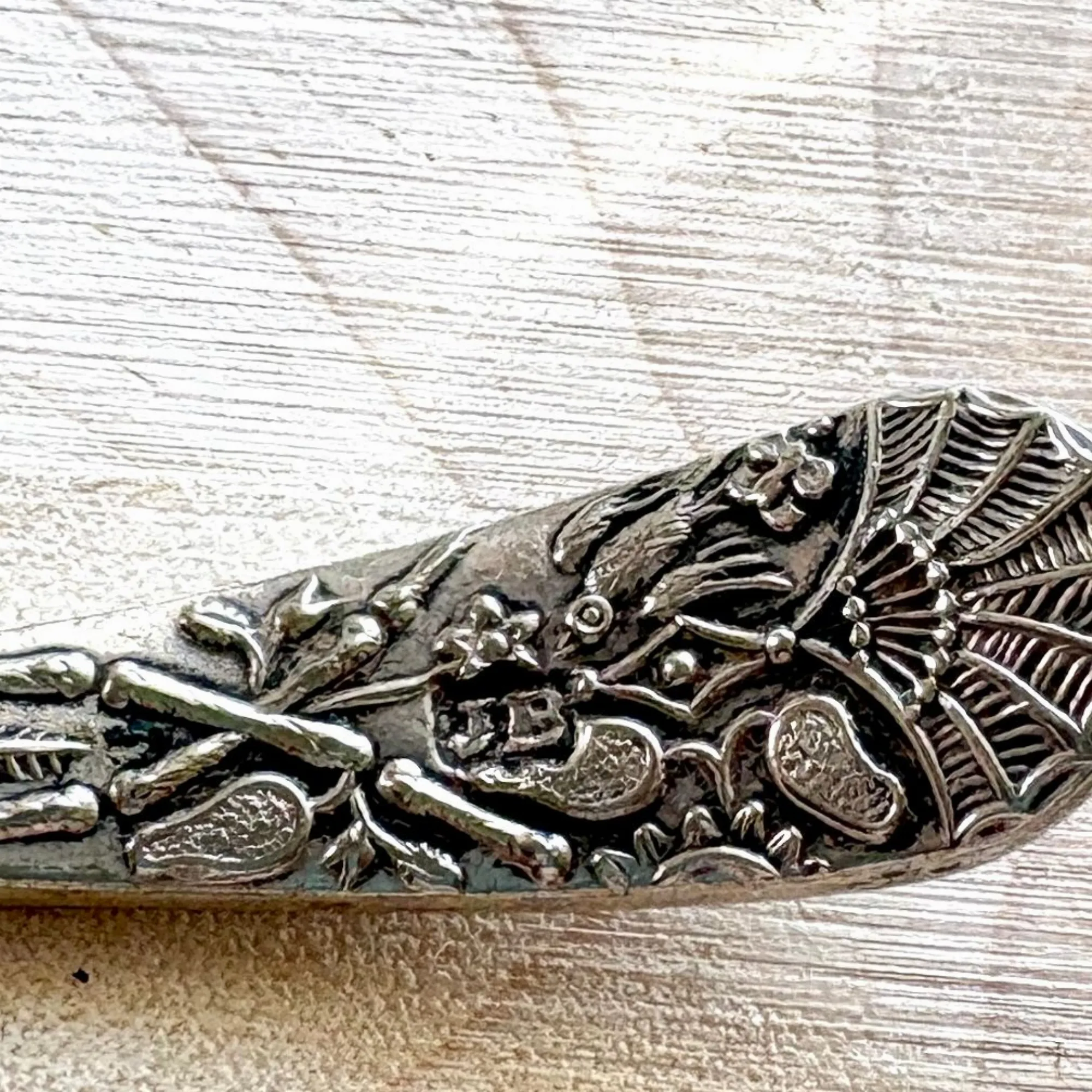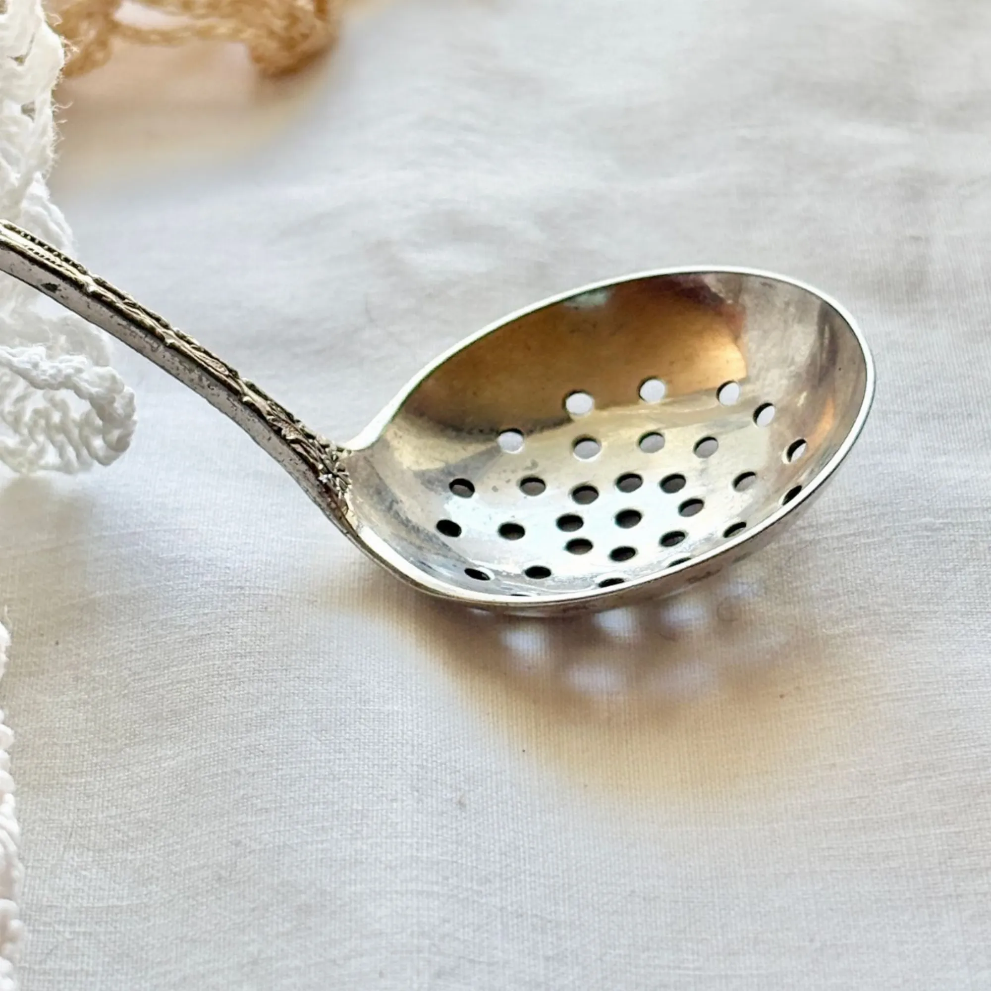 - Le Verso (Le Secret) : C'est mon détail préféré ! Juste au-dessus du cuilleron percé, une minuscule ciselure révèle un héron (ou échassier) niché au cœur de la végétation aquatique. Un travail d'une finesse incroyable pour un objet de cette taille.